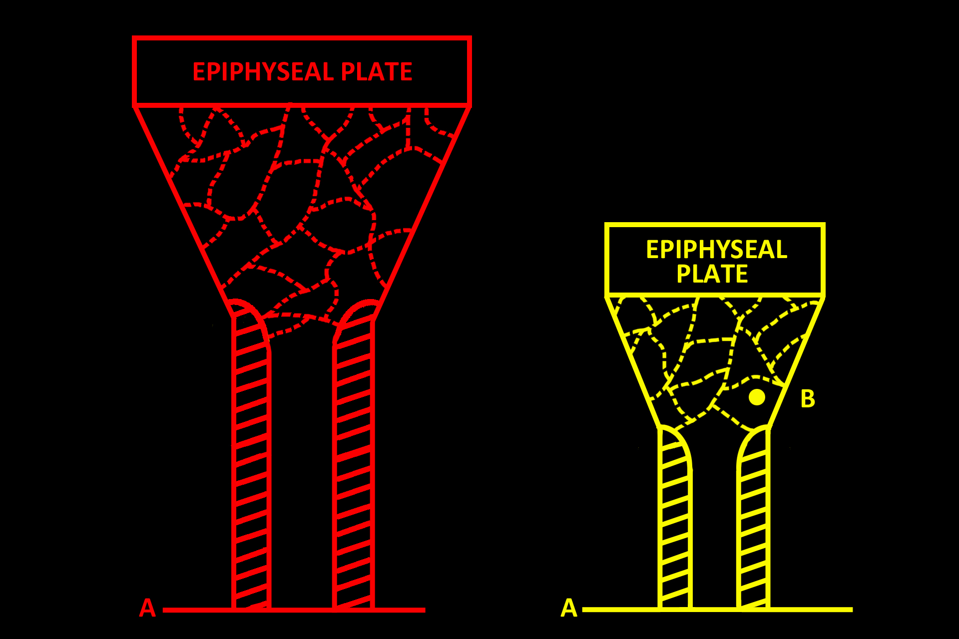 Bone remodeling during growth is an intricate process involving both bone deposition and bone resorption. During growth in length, the correct proportion of diaphysis to epiphyses must be maintained. Simultaneously, a bone must also increase in diameter as it supports the increased body mass associated with increased height. These two sketches illustrate changes occurring to a long bone during growth in length. The yellow bone is the original size of the bone, and the red bone is the same bone after a period of growth.